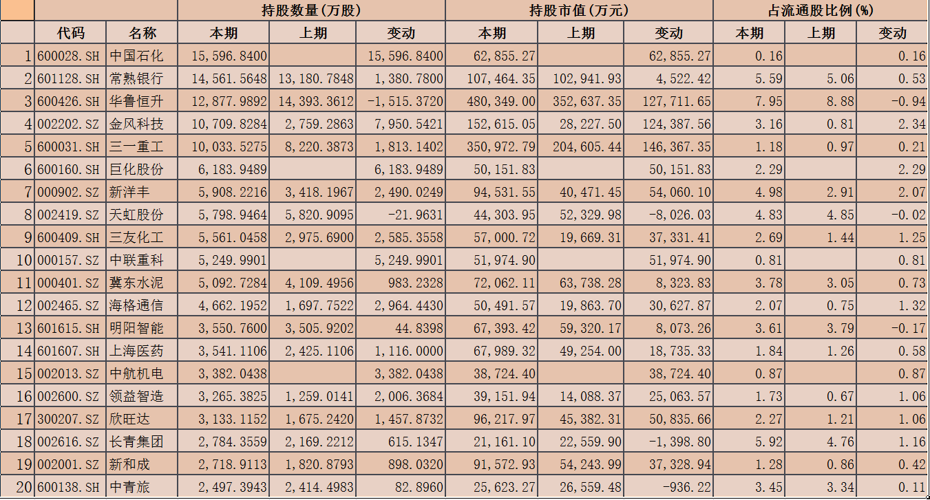 從持股數(shù)量來(lái)看,截至2020年四季度末,上述87家公司中,中國(guó)石化、常熟銀行、華魯恒升、金風(fēng)科技和三一重工等5家公司社保基金持股數(shù)量居前,均在1億股以上。