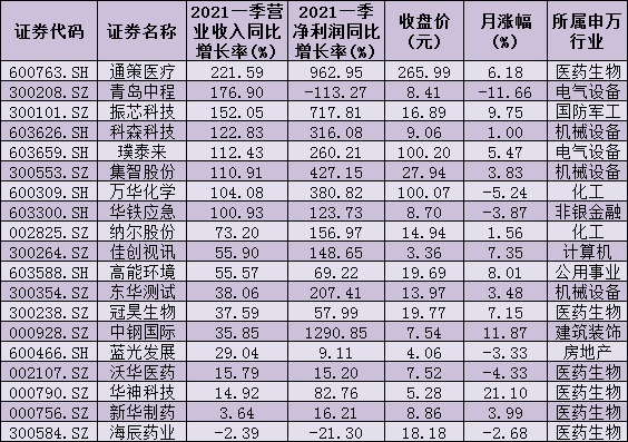 具體來看,中鋼國際一季度凈利潤同比增幅居首,為1290.85%。緊隨其后的通策醫(yī)療、振芯科技、集智股份、萬華化學、科森科技、璞泰來、東華測試、納爾股份、佳創(chuàng)視訊、華鐵應急等10家公司,今年一季度凈利潤同比增長也均超過100%。