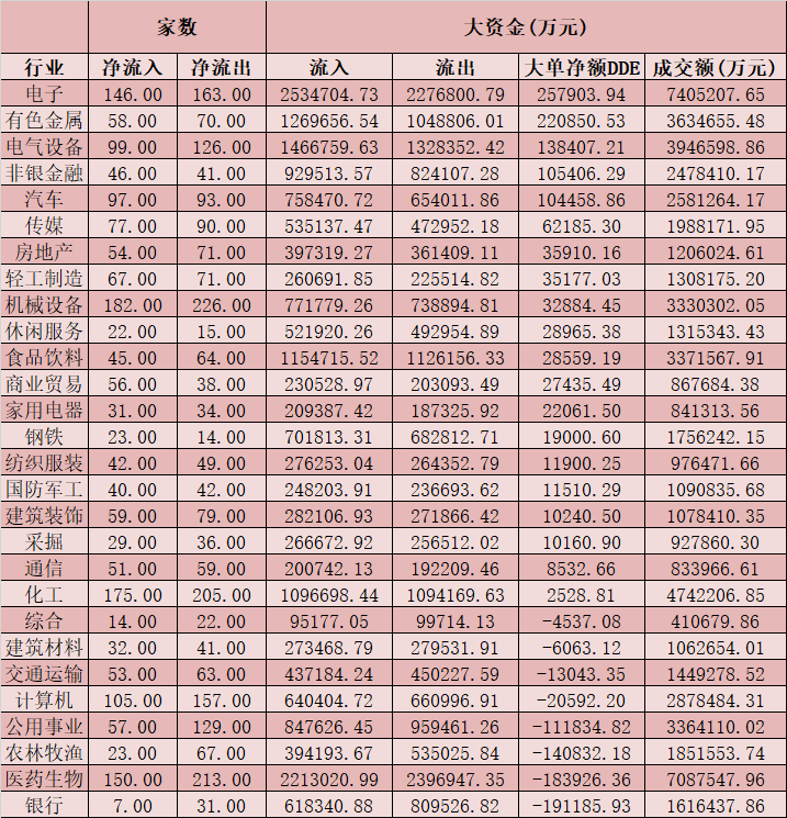 從資金層面看,周三,A股大單資金整體凈流入50.17億元,其中,有1828只個(gè)股呈現(xiàn)資金凈流入,2298只個(gè)股呈現(xiàn)資金凈流出。在申萬一級(jí)的28個(gè)行業(yè)中,有20個(gè)行業(yè)實(shí)現(xiàn)大單資金凈流入,其中,電子、有色金屬、電氣設(shè)備、非銀金融、汽車等五大行業(yè)大單資金凈流入金額均在10億元以上,另外,銀行、醫(yī)藥生物、農(nóng)林牧漁、公用事業(yè)等四大行業(yè)大單資金凈流出均超10億元。