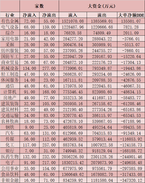 從資金層面看,周四,A股大單資金整體凈流出228.12億元,其中,有1331只個(gè)股呈現(xiàn)資金凈流入,2743只個(gè)股呈現(xiàn)資金凈流出。在申萬一級的28個(gè)行業(yè)中,有3個(gè)行業(yè)實(shí)現(xiàn)大單資金凈流入,有色金屬行業(yè)大單資金凈流入居首,達(dá)到13.55億元,電氣設(shè)備、綜合等行業(yè)大單資金凈流入則分別為7821.28萬元、2011.09萬元,另外,食品飲料、非銀金融等兩大行業(yè)大單資金凈流出均超30億元。