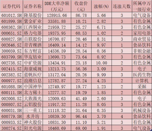一、周四(4月15日)DDE大單資金凈買入TOP20
