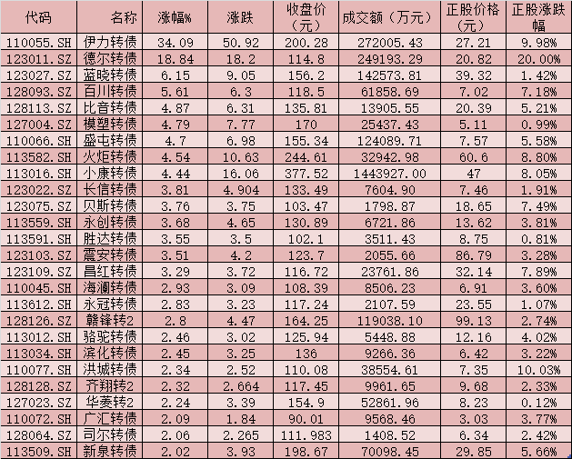 《證券日報》記者根據(jù)同花順數(shù)據(jù)統(tǒng)計發(fā)現(xiàn),4月28日,在358只可轉(zhuǎn)債中,有26只漲幅超2%,伊力轉(zhuǎn)債、德爾轉(zhuǎn)債漲幅均超18%,分別為34.09%、18.84%,藍曉轉(zhuǎn)債(6.15%)、百川轉(zhuǎn)債(5.61%)、比音轉(zhuǎn)債(4.87%)、模塑轉(zhuǎn)債(4.79%)、盛屯轉(zhuǎn)債(4.7%)、火炬轉(zhuǎn)債(4.54%)和小康轉(zhuǎn)債(4.44%)等漲幅也均逾4%,盡顯強勢。