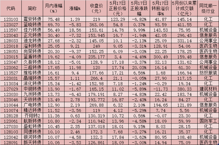 表:5月份以來(lái)累計(jì)漲幅超10%的可轉(zhuǎn)債一覽
