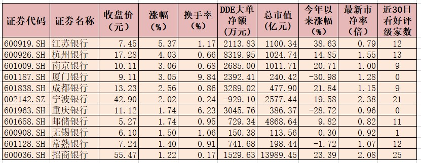 表:5月20日漲幅超1%銀行股一覽