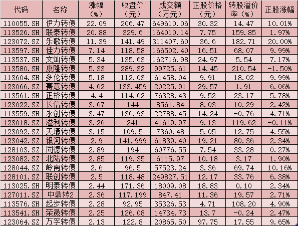 《證券日?qǐng)?bào)》記者對(duì)同花順數(shù)據(jù)統(tǒng)計(jì)后發(fā)現(xiàn),在362只可轉(zhuǎn)債中,251只可轉(zhuǎn)債實(shí)現(xiàn)上漲,占比近七成。其中,23只可轉(zhuǎn)債漲幅超2%,伊力轉(zhuǎn)債、聯(lián)泰轉(zhuǎn)債、樂(lè)歌轉(zhuǎn)債等3只可轉(zhuǎn)債漲幅均在10%以上,分別為22.09%、20.88%、11.39%,佳力轉(zhuǎn)債、文燦轉(zhuǎn)債、康隆轉(zhuǎn)債、多倫轉(zhuǎn)債等4只可轉(zhuǎn)債漲幅也位居前列,均超5%。