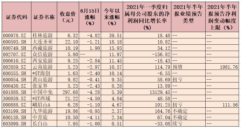 與此同時(shí),旅游板塊公司的業(yè)績(jī)也在恢復(fù)向好,同花順數(shù)據(jù)顯示,有19家景點(diǎn)及旅游公司今年一季度歸屬母公司股東的凈利潤(rùn)實(shí)現(xiàn)同比增長(zhǎng),占比超七成,其中,中國(guó)中免、宋城演藝、九華旅游、云南旅游、峨眉山A等5家公司今年一季度歸屬母公司股東的凈利潤(rùn)同比增長(zhǎng)率均超100%。此外,截至6月15日收盤(pán),有9家景點(diǎn)及旅游公司發(fā)布了今年上半年業(yè)績(jī)預(yù)告,有3家公司業(yè)績(jī)預(yù)喜,其中,云南旅游業(yè)績(jī)預(yù)增,峨眉山A和黃山旅游預(yù)計(jì)扭虧。