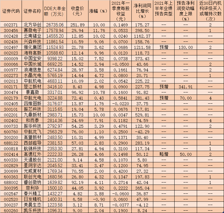 值得一提的是,市場(chǎng)做多資金也開(kāi)始加倉(cāng)航天軍工股,6月17日,航天軍工板塊中共有88只個(gè)股呈現(xiàn)大單資金凈流入態(tài)勢(shì),其中,有34只個(gè)股大單資金凈流入超過(guò)1000萬(wàn)元,合計(jì)吸金17.84億元。北方華創(chuàng)大單資金凈流入居首,達(dá)到2.67億元,賽微電子、云南鍺業(yè)、興森科技、雅化集團(tuán)、海特高新等4只個(gè)股當(dāng)日也均受到1億元以上大單資金搶籌。