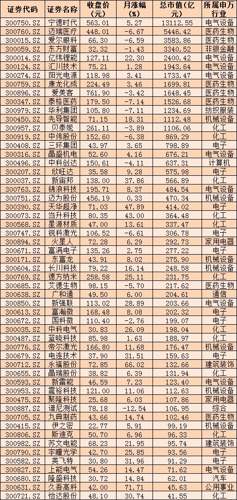 記者統(tǒng)計發(fā)現(xiàn),7月份以來截至周二收盤,有55家創(chuàng)業(yè)板上市公司的股價,創(chuàng)出了歷史新高。其中,寧德時代、邁瑞醫(yī)療、愛爾眼科、東方財富、億緯鋰能、匯川技術(shù)、陽光電源、康龍化成、愛美客、泰格醫(yī)藥、華利集團、先導(dǎo)智能、貝泰妮等13只創(chuàng)業(yè)板公司的總市值均在千億元以上。