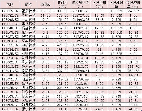 在可交易的可轉(zhuǎn)債中,7月19日,有13只可轉(zhuǎn)債成交額均超10億元,藍(lán)盾轉(zhuǎn)債成交額居首,達(dá)到73.29億元,一品轉(zhuǎn)債、盛路轉(zhuǎn)債緊隨其后,成交額也分別達(dá)到24.49億元、22.29億元,百川轉(zhuǎn)債、拓爾轉(zhuǎn)債、久吾轉(zhuǎn)債、金諾轉(zhuǎn)債、華自轉(zhuǎn)債、鼎勝轉(zhuǎn)債、中礦轉(zhuǎn)債、隆利轉(zhuǎn)債、華鋒轉(zhuǎn)債、盛屯轉(zhuǎn)債等10只可轉(zhuǎn)債成交額也均逾10億元。