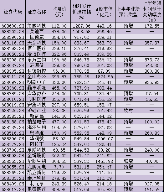 表:最新收盤價較發(fā)行價漲幅在500%以上的科創(chuàng)板股一覽