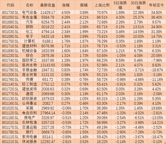 行業(yè)指數(shù)方面,28類申萬一級行業(yè)中有20類上漲,電氣設備(4.50%)、有色金屬(4.26%)、汽車(2.44%)等居前三位,下跌的前三類行業(yè)為休閑服務(-2.81%)、家用電器(-0.89%)、銀行(-0.85%)。個股方面,呈漲多跌少態(tài)勢,漲跌比為2.08。