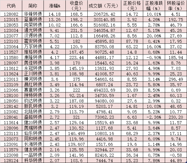 具體到個券方面,8月3日,在370只可轉債中,有28只可轉債漲幅超2%,華鋒轉債、藍盾轉債、尚榮轉債等3只可轉債漲幅均超10%,分別達到14.18%、13.26%、10.02%,通光轉債(9.41%)、漢得轉債(7.02%)、震安轉債(5.51%)、萬孚轉債(4.22%)、維格轉債(4.2%)和康隆轉債(4.17%)等6只可轉債漲幅也均在4%以上。