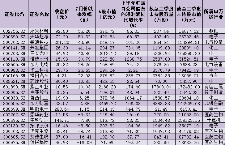 上述21家獲社?;鹦逻M(jìn)增持公司,上半年凈利潤(rùn)均實(shí)現(xiàn)同比增長(zhǎng),其中,諾德股份、魯西化工等兩家公司上半年凈利潤(rùn)同比增長(zhǎng)均在10倍以上,分別為1238.75%、1064.17%。此外,明微電子、興發(fā)集團(tuán)、福田汽車(chē)、健民集團(tuán)、紫金礦業(yè)、東方財(cái)富、拓邦股份、錦浪科技等公司上半年凈利潤(rùn)同比增長(zhǎng)也均在100%以上。