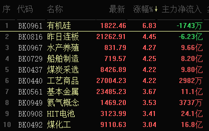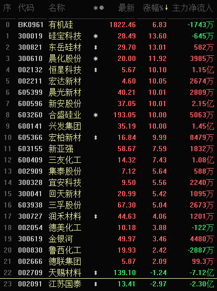 從盤面來看,有機硅板塊指數(shù)飆升6.83%,排名第一,板塊大單資金凈流出達1743萬元,有恒星科技等7只個股漲停。