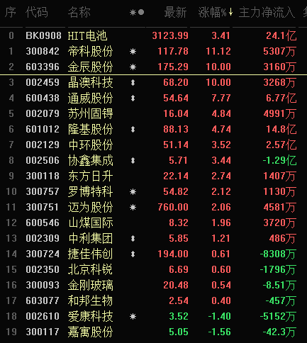 HIT電池(又被稱為HJT)保持強勢,板塊上漲3.41%,大單資金凈流入達24.1億元,概念板塊近3日漲幅達11.48%,金辰股份和晶澳科技今日漲停。