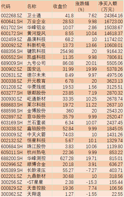 有31只個股受到前十大營業(yè)部搶籌,其中,衛(wèi)士通(24364.16萬元)、萬業(yè)企業(yè)(16723.00萬元)、華峰鋁業(yè)(15038.67萬元)、黃河旋風(fēng)(14618.37萬元)、晶澳科技(11742.02萬元)、科新機電(10608.01萬元)等6只個股凈買入額過億元。
