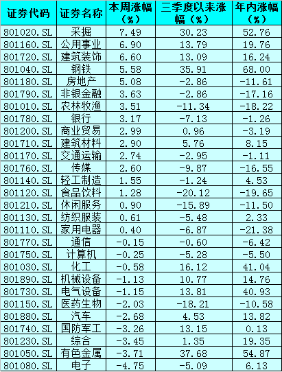 從申萬(wàn)一級(jí)28個(gè)行業(yè)來(lái)看,上周有17個(gè)行業(yè)實(shí)現(xiàn)上漲,其中,采掘、公用事業(yè)、建筑裝飾、鋼鐵、房地產(chǎn)等行業(yè)指數(shù)周漲幅均超5%。另外,電子行業(yè)指數(shù)周跌幅居首,周跌幅達(dá)到4.75%。