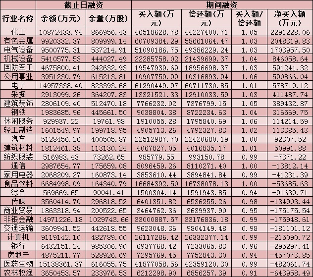 從行業(yè)分布來看,下半年以來,在28個申萬一級行業(yè)中,14個行業(yè)期間獲融資凈買入。其中,化工、有色金屬、電氣設(shè)備等三行業(yè)最受融資客青睞,融資凈買入額均超100億元,分別為229.12億元、204.83億元和170.4億元,合計達604.35億元;緊隨其后的是機械設(shè)備、國防軍工、公用事業(yè)、電子等行業(yè),融資凈買入額均超50億元。