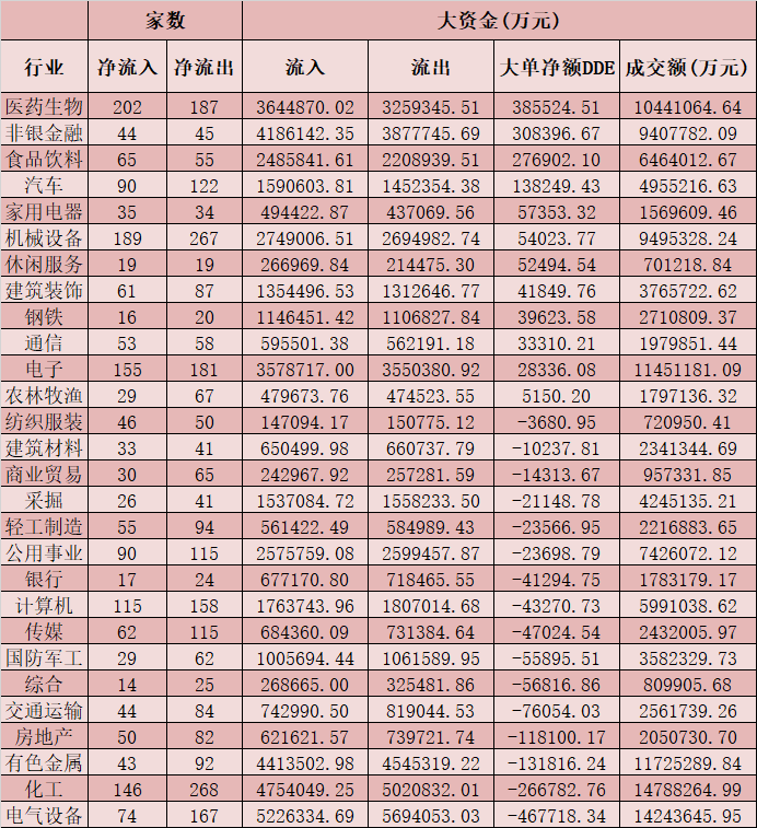 表:9月6日申萬(wàn)一級(jí)行業(yè)大單資金情況