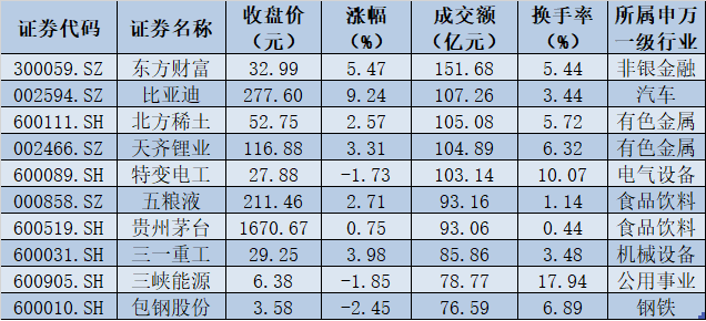 成交量方面,周一,滬深兩市合計(jì)成交額14261.48億元,連續(xù)第34個(gè)交易日突破1萬(wàn)億元。部分前期跌幅較大的傳統(tǒng)白馬股出現(xiàn)反彈,熱門(mén)賽道及上游資源股分化明顯,東方財(cái)富、比亞迪、北方稀土、天齊鋰業(yè)、特變電工等5只個(gè)股成交額均超百億元。
