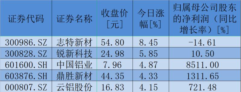 表:9月6日,申萬鋁板塊股價漲幅超4%個股一覽