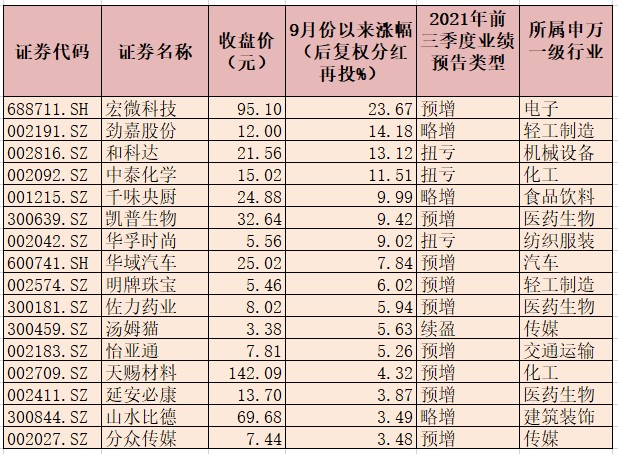 表:9月份以來漲幅超3%的業(yè)績預(yù)喜股一覽