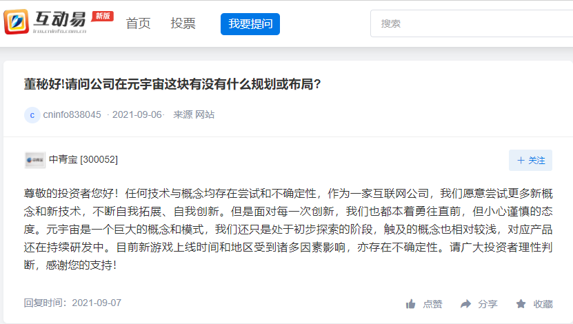 昨日,中青寶對投資者在互動平臺上的問題“請問公司在元宇宙這塊有沒有什么規(guī)劃或布局?”作出回應(yīng)。