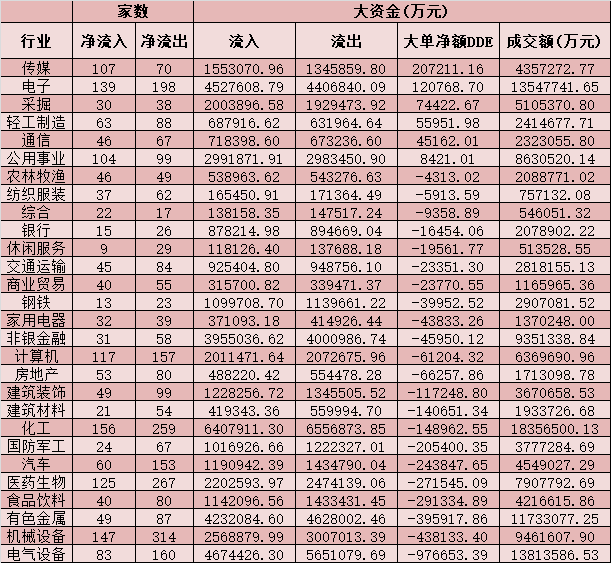 資金流向方面,周三,滬深兩市大單資金凈流出307.72億元,其中,1679只個股呈現(xiàn)資金凈流入,2755只個股呈現(xiàn)資金凈流出。從申萬一級行業(yè)來看,僅6個行業(yè)呈現(xiàn)資金流入態(tài)勢。傳媒和電子等兩行業(yè)大單資金凈流入均在10億元以上。
