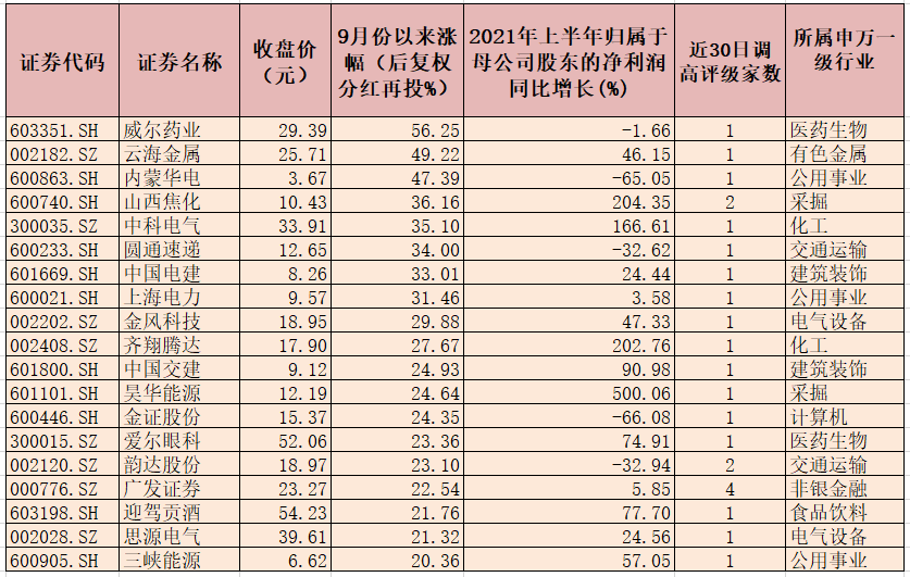 從市場表現(xiàn)來看,9月份以來,上述207只獲得調高評級的個股中有112只個股實現(xiàn)上漲,占比超五成,其中,威爾藥業(yè)、云海金屬、內蒙華電、山西焦化、中科電氣、圓通速遞、中國電建、上海電力等8只個股期間累計漲幅均超30%,表現(xiàn)強勢。