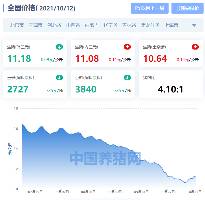 其次,生豬現(xiàn)貨市場行情已有好轉(zhuǎn)跡象。10月12日,中國養(yǎng)豬網(wǎng)養(yǎng)豬數(shù)據(jù)中心數(shù)據(jù)顯示:生豬(外三元)均價為11.18元/公斤,價格較10月6日上漲了0.55元/公斤;生豬(內(nèi)三元)價格為11.08元/公斤,價格較前10月6日上漲了0.69元/公斤;生豬(土雜豬)價格為10.64元/公斤,較10月6日上漲0.64元/公斤。“節(jié)后以來,國內(nèi)生豬現(xiàn)貨價格有抬頭跡象,多數(shù)地區(qū)豬價普遍上漲。當(dāng)前國內(nèi)部分地區(qū)交通運(yùn)輸出現(xiàn)困難,加上大體重豬源消耗充分均導(dǎo)致現(xiàn)貨逐步好轉(zhuǎn)。”陳界正表示。
