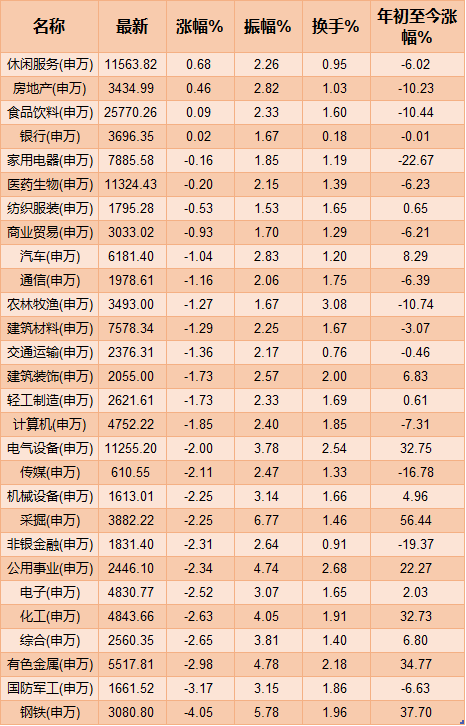 具體來看,行業(yè)板塊僅有休閑服務(wù)、房地產(chǎn)、食品飲料和銀行等4類飄紅,鋼鐵與有色金屬等周期股領(lǐng)跌。