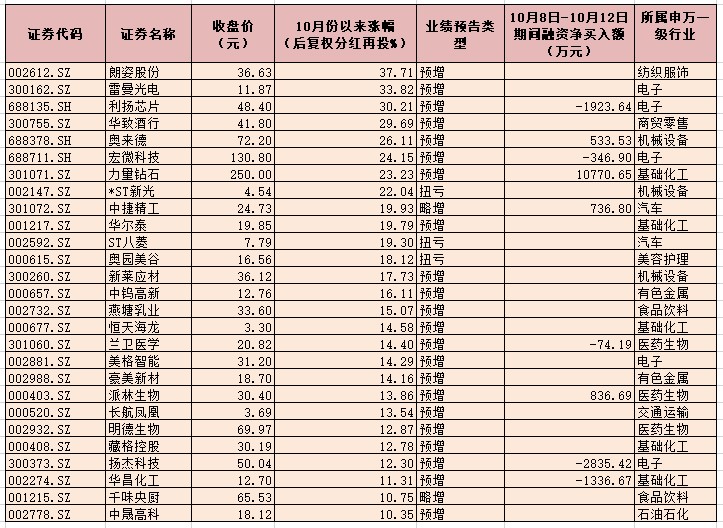 表:10月份以來漲幅超10%的業(yè)績預(yù)喜股一覽