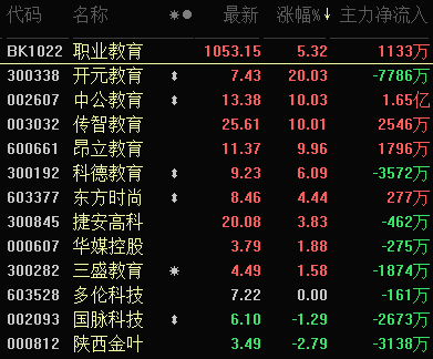 職業(yè)教育上漲5.32%居概念板塊漲幅第二位,12只交易中的個(gè)股有9只上漲,其中,開元教育、中公教育、傳智教育和昂立教育等4個(gè)股漲停報(bào)收。