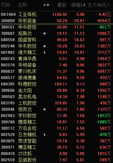 概念板塊方面,工業(yè)母機(jī)漲幅居前,漲幅達(dá)5.98%,40只交易中的個(gè)股有36只上漲,占比九成,其中,華辰裝備、華東數(shù)控、海天精工、青海華鼎、華明裝備、秦川機(jī)床等6只個(gè)股漲停報(bào)收。