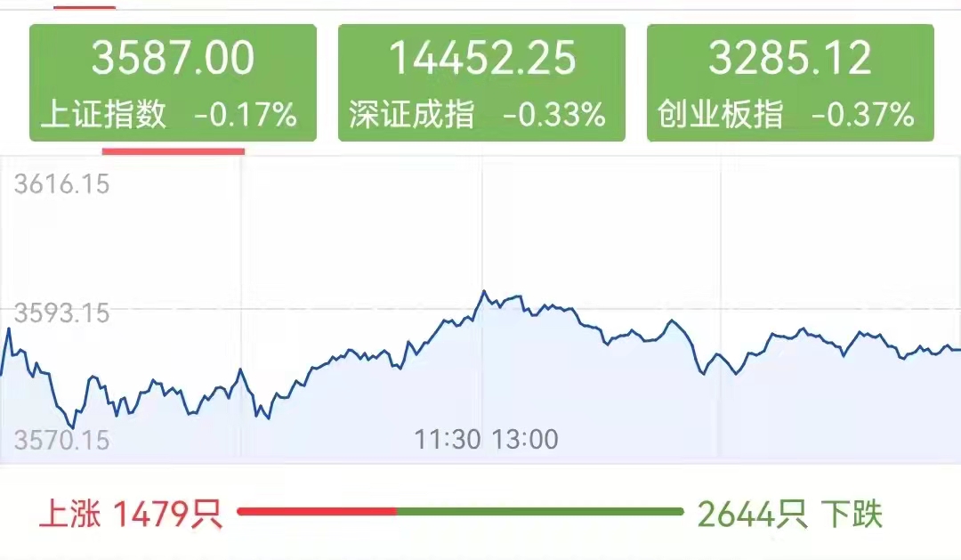 震蕩徘徊,成為周三A股市場走勢的主要特征。周三,三大指數(shù)震蕩走弱,截至收盤,上證指數(shù)微跌0.17%,報3587點,深證成指跌0.33%,報14452.25點,創(chuàng)業(yè)板指跌0.37%,報3285.12點;兩市合計成交額達(dá)10202億元,成交額突破1萬億元關(guān)口。北向資金凈買入40.79億元;總體來看,兩市個股跌多漲少。