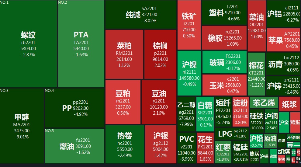 國內(nèi)商品期貨多數(shù)收跌,錳硅、硅鐵、甲醇、焦煤、焦炭、尿素、純堿、動力煤、乙二醇、PVC跌停,滬鋅、滬鋁跌逾6%,短纖跌逾5%,塑料、PP、瀝青LPG跌超4%,滬銅、螺紋、熱卷跌超2%。