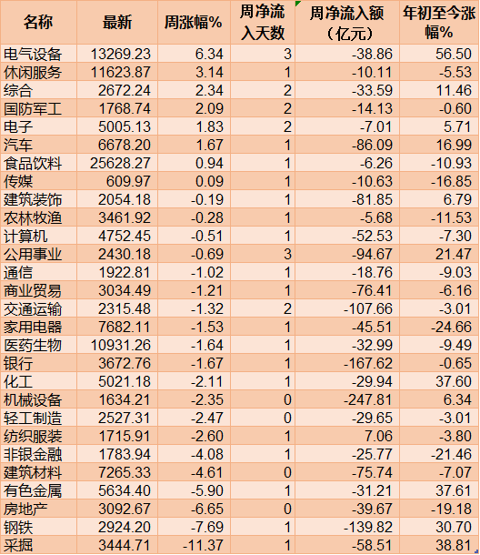 從申萬一級行業(yè)來看,本周逾8類申萬一級行業(yè)實現(xiàn)上漲,其中,電氣設備(6.34%)、休閑服務(3.14%)、綜合(2.34%)、國防軍工(2.09%)等4類行業(yè)指數(shù)周漲幅均超2%。此外,采掘(-11.37%)、鋼鐵(-7.69%)、房地產(chǎn)(-6.65%)、有色金屬(-5.90%)等4類行業(yè)指數(shù)周跌幅均超5%。