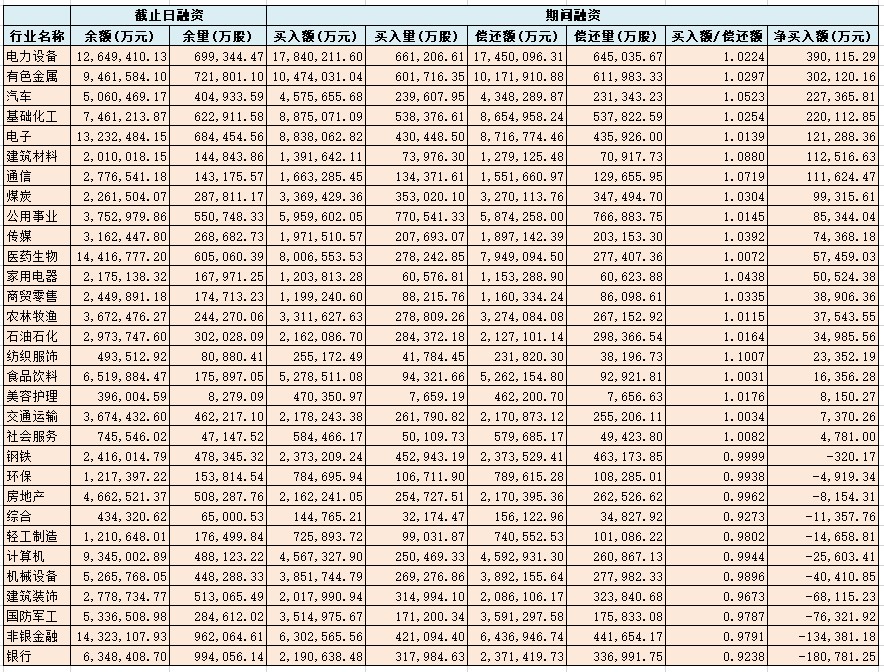 融資客在10月份加倉超百億元的同時(shí),其在行業(yè)投資布局方面卻表現(xiàn)出了明顯的差異性。從申萬一級行業(yè)來看,31個(gè)行業(yè)中有20個(gè)行業(yè)在10月份獲得融資客加倉,電力設(shè)備、有色金屬、汽車、基礎(chǔ)化工等四大行業(yè)受到特別青睞,期間累計(jì)凈買入額分別為39.01億元、30.21億元、22.74億元、22.01億元。而大金融板塊則遭到大額賣出,銀行和非銀金融遭到融資客凈賣出額居前,分別為18.08億元、13.44億元。