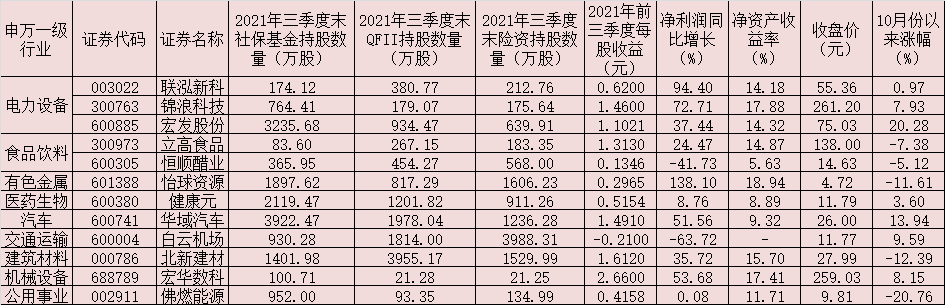 同花順數(shù)據(jù)統(tǒng)計(jì)顯示,截至三季度末,白云機(jī)場(chǎng)、北新建材、華域汽車、宏發(fā)股份、恒順醋業(yè)、立高食品、錦浪科技、佛燃能源、聯(lián)泓新科、健康元、怡球資源、宏華數(shù)科等12家公司股票的前十大流通股股東中同時(shí)出現(xiàn)社?;?、QFII及險(xiǎn)資身影,涉及9個(gè)申萬(wàn)一級(jí)行業(yè),電力設(shè)備行業(yè)有3家公司股票,食品飲料行業(yè)有2家公司股票。