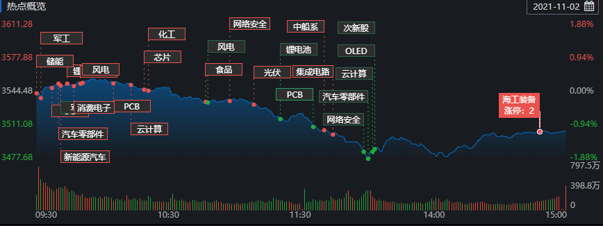 11月2日,A股市場(chǎng)呈現(xiàn)震蕩下行走勢(shì),午后快速探低,滬指一度跌近2%至3500點(diǎn)以下。國(guó)防軍工、食品加工、種植業(yè)等多板塊持續(xù)活躍,中船系全天強(qiáng)勢(shì)領(lǐng)漲,中船應(yīng)急午后封住漲停,證券、銀行等大金融板塊走弱,煤炭、鋼鐵等周期股大幅下挫。