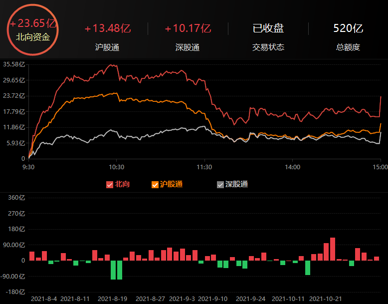11月2日,北向資金凈買(mǎi)入23.65億元,其中,滬股通凈買(mǎi)入額達(dá)13.48億元,深股通凈買(mǎi)入額達(dá)10.17億元。
