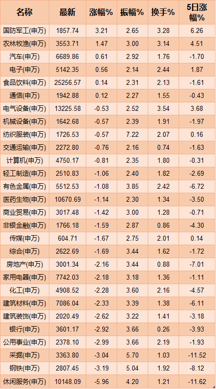 從申申萬(wàn)行業(yè)指數(shù)方面來(lái)看,僅國(guó)防軍工、農(nóng)林牧漁、汽車(chē)、電子、食品飲料、通信等6個(gè)行業(yè)指數(shù)實(shí)現(xiàn)上漲,其余行業(yè)指數(shù)均有不同程度的下跌,采掘、鋼鐵、休閑服務(wù)等3個(gè)行業(yè)指數(shù)跌幅居前,均跌超3%。