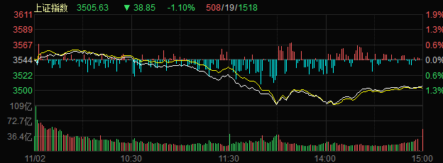 截至收盤(pán),上證指數(shù)跌1.1%,報(bào)3505.63點(diǎn);深證成指跌0.69%,報(bào)14377.27點(diǎn);創(chuàng)業(yè)板指漲0.23%,報(bào)3339.6點(diǎn),滬深兩市合計(jì)成交額12581.41億元,兩市成交額連續(xù)第8個(gè)交易日突破1萬(wàn)億元;兩市個(gè)股也呈現(xiàn)普跌態(tài)勢(shì),超3364只個(gè)股收跌。