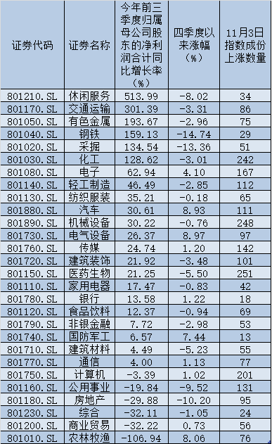 表:今年前三季度申萬一級行業(yè)業(yè)績表現(xiàn)