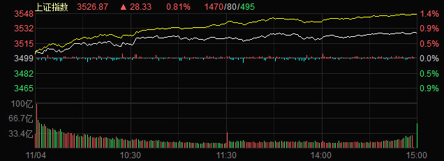 11月4日,A股三大指數(shù)盤中持續(xù)拉升,集體收漲,深成指表現(xiàn)較強。截至收盤,上證指數(shù)漲0.81%,深證成指漲1.3%,創(chuàng)業(yè)板指漲1.06%;滬深兩市合計成交額10787.11億元,兩市成交額連續(xù)第10個交易日突破1萬億元;總體來看,兩市個股普漲, 3311只個股上漲。