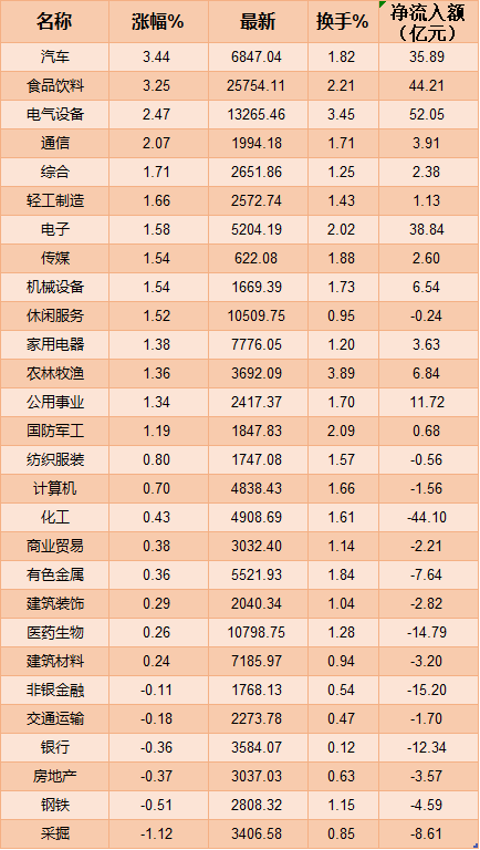 從申萬行業(yè)指數(shù)方面來看,有22類行業(yè)上漲,其中,汽車(3.44%)、食品飲料(3.25%)、電氣設(shè)備(2.47%)、通信(2.07%)等4類行業(yè)指數(shù)漲幅均超2%,有6類行業(yè)下跌,采掘居前,跌幅達(dá)1.12%。