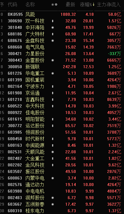 23只風(fēng)能概念股漲停,成長性持續(xù)強化。