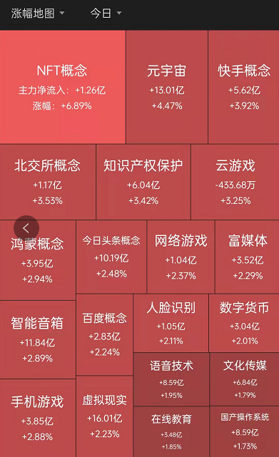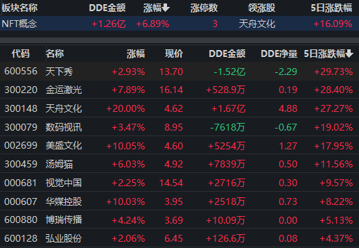 今日,NFT概念啟動,天舟文化收20CM漲停,美盛文化和華媒控股收獲10CM漲停,板塊內(nèi)個股全線上漲。5日內(nèi)漲幅超20%的股票就達到3只。