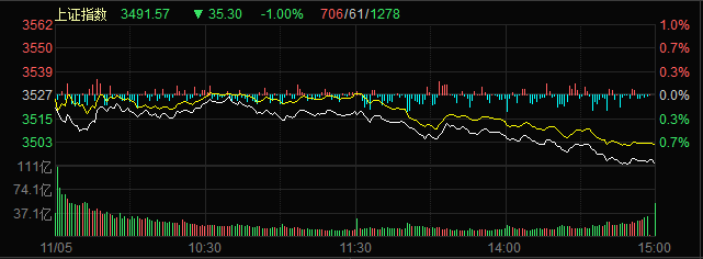 11月5日,A股三大指數(shù)震蕩走弱,集體收跌。截至收盤,上證指數(shù)跌1%,失守3500點關(guān)口,深證成指跌0.64%,創(chuàng)業(yè)板指跌0.28%;滬深兩市合計成交額11511.47億元,兩市成交額連續(xù)第11個交易日突破1萬億元;總體來看,兩市個股跌多漲少。此外,回顧本周三大指數(shù)的走勢來看,上證指數(shù)期間累計下跌1.57%,深證成指期間累計上漲0.08%,創(chuàng)業(yè)板指期間累計上漲0.06%。