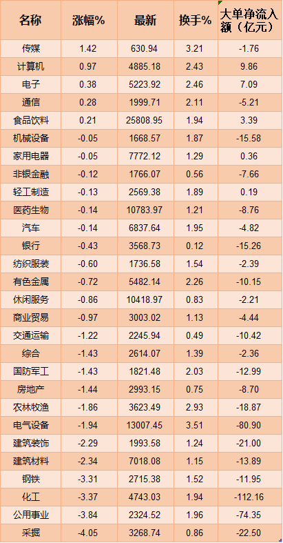 從申萬行業(yè)指數(shù)方面來看,僅有5類行業(yè)上漲,分別為:傳媒(1.42%)、計算機(0.97%)、電子(0.38%)、通信(0.28%)、食品飲料(0.21%),另有23類行業(yè)下跌,采掘居首,跌幅達4.05%。